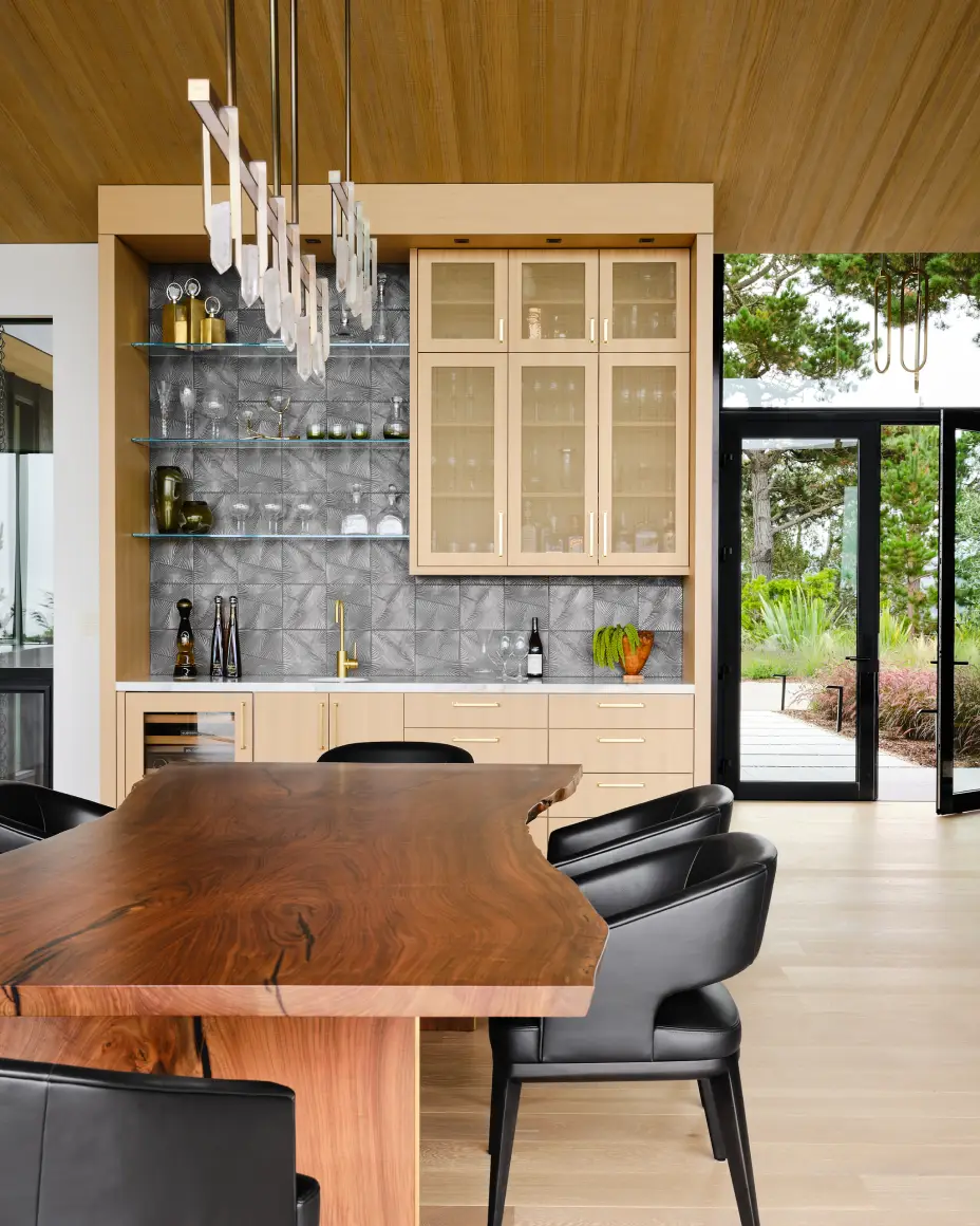 The dining table is conceived as a central gathering piece, crafted from a single, massive Claro Walnut slab milled from a salvaged tree in South Monterey County on a Rio Farms ranch in King City. Designed to comfortably seat ten, the table celebrates the scale and character of the original tree, grounding the dining space with a strong sense of material authenticity and place.
