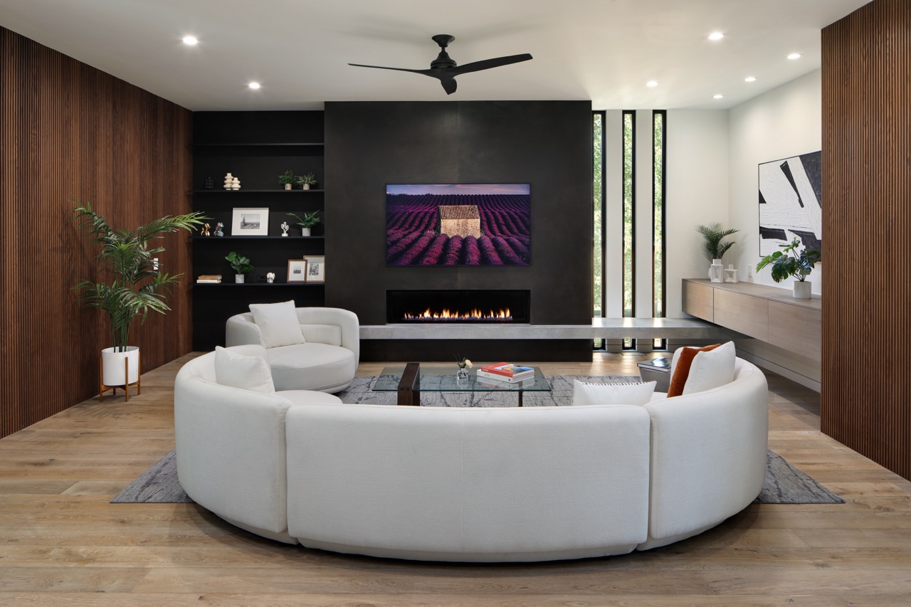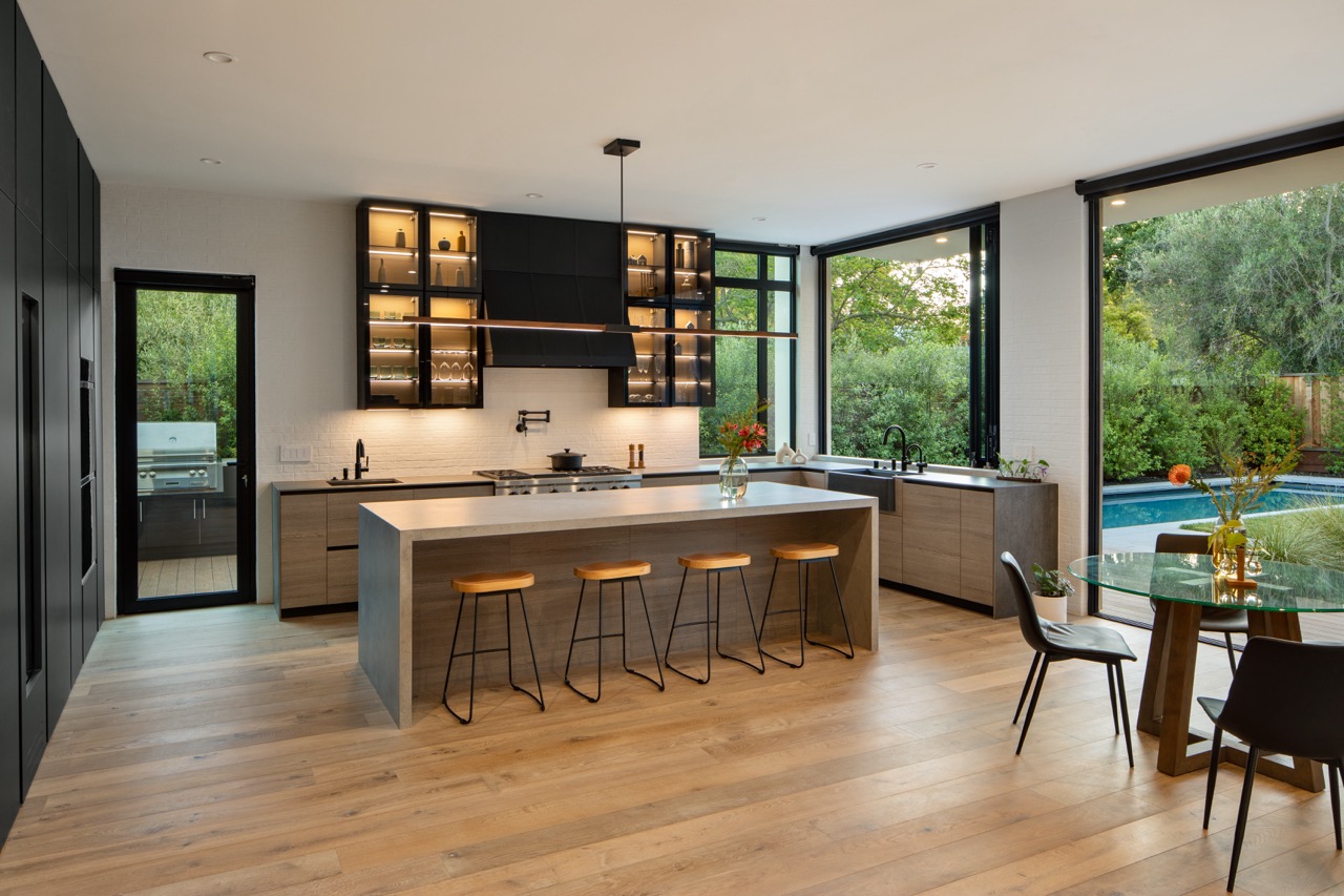 At the rear of the property, the master suite creates a west-facing courtyard anchored by a shimmering lap pool that provides both exercise and visual calm for the homeowners.
