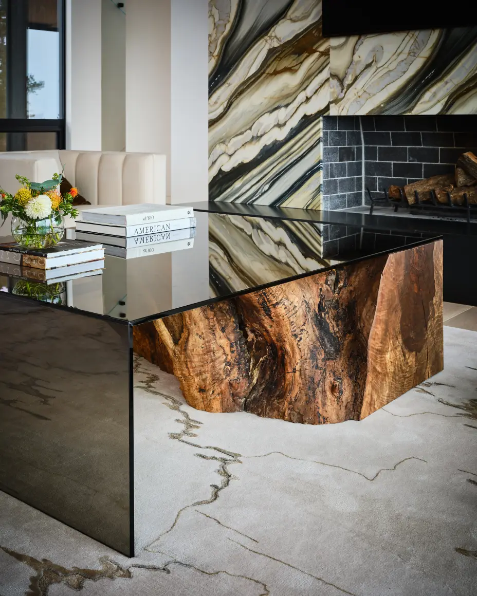 Where the forest meets the sea. Designed in collaboration with custom woodworker Aaron Osgood, this walnut stump coffee table is finished with smoked glass to blur the boundary between indoors and out. Its form and waterfall edge were intentionally designed to mimic the kitchen island across the great room, creating continuity and balance throughout the space.